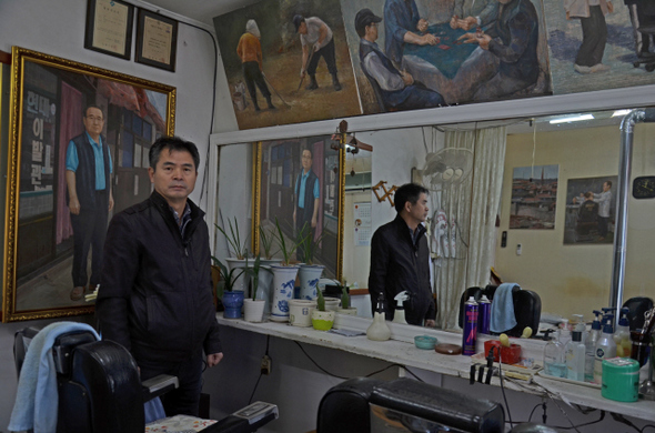 그림이 그 자리에 살던 달동네 주민들의 역사를 전한다. 화가 이성국씨는 10년 동안 백사마을을 드나들며 주민들의 사연과 풍경을 채집해 그림으로 그려왔다. 그의 전시회가 열린 마을의 이발소. 이성국 제공