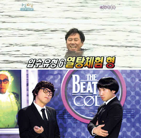 ‘1박2일’에서 윤종신은 등장부터 남달랐다. 음악은 유 희열에게 맡겨버리고 자신은 “확실한 웃음”을 주겠다고 선언했다. 적극적인 리액션과 몸동작을 활용한 멘트는 그간 다양한 예능 프로그램에 출연하며 몸에 익혀온 산 물이다. 자신의 체형을 희화화한 ‘알 밴 시샤모’나 윤상 의 일상적 허세를 폭로하는 애드리브는 20년 지기 음악 동료들과 평소 농담처럼 주고받던 이야기를 방송용으로 적절히 녹여낸 것이다. 예능인으로서의 학습과 일상적 감각이 시너지를 발휘한 이날의 재기발랄함은 겨울바다 입수 내기에서 정점을 찍었다. 이런 내기에서 져본 적이 없다며 호언장담하더니 결국은 입수행. 어린아이 열탕 들어가듯 소심한 입수는 모두를 배꼽 잡게 했다. 그 장 면은 방송이 끝난 뒤 인터넷에서 ‘명품 입수’라느니 ‘1박2 일 입수 역사를 새로 썼다’느니 여러 차례 회자됐다.