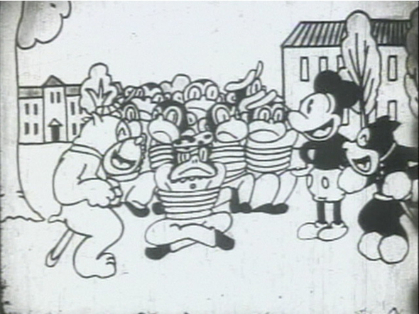 노라쿠로는 미키마우스를 베껴왔다. 1920~30년대 일본의 완구용 영사기에서 상영되는 29초짜리 애니메이션에서는 미키마우스와 노라쿠로가 함께 등장한다. 일본 제작, 연대 불명.