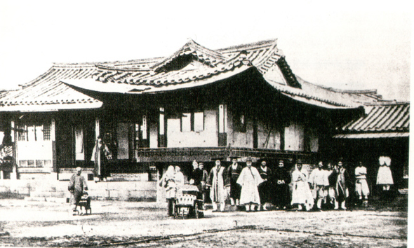 서울 박동(수송동) 묄렌도르프의 저택. 1884년께 통리아문 및 해관 관리들과 함께 찍은 사진으로 추정된다. 넓은 정원을 서양식으로 꾸미고 테니스장까지 만들었다고 하는데, 사진 하단의 직각으로 굽은 선이 테니스장 선으로 보인다. 전우용 제공