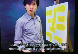 비디오 작업과 페인팅 작업으로 이뤄진 <노란 비명>은 작가가 던지는 질문과 해답이 반사거울처럼 각각을 우스꽝스럽게 비추는 형국이다. 교육방송의 그 유명한 밥 로스 아저씨를 패러디하고 있는 영상 속 남자는 “참 쉽죠? 자 이제 거의 다 됐네요”라며 ‘노란 비명’ 그리기를 몸소 실천한다. 눈에 보이지 않는 노란 비명이라니 어떻게 그릴 수 있단 말일까? 끼야아아악, 꺅, 어하하하하, 안에 응어리져 있던 묵직한 비명 소리를 내며 노란색을 휙 그은 남자는 이어 짜증이 담긴 비명도 그려봐야 한다며 꺅 소리를 짧게 지른다. 그리고 예의 능청스러운 지도자의 말투로 희열에 찬 비명도 있다며 경쾌하게 끼야악 소리를 ‘기’를 불어넣듯이 화면을 향해 지른다. 소리를 내는 시간과 강도만큼 노란색을 칠하며 그림을 완성해나가는 남자의 논리는 기괴하지만 밥 로스의 말투처럼 단호하고 군더더기가 없어서 묘하게 빠져들게 된다. 2012년 광주 비엔날레에 선보였던 이 작품을 보며 많은 관람객이 웃음을 참지 못했다.