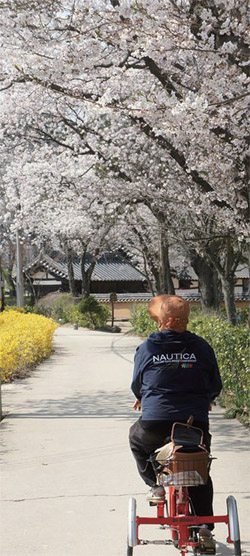 강원도 강릉에 있는 허난설헌의 생가를 향해 난 길에 동화처럼 봄꽃이 만개했다. 김진 변호사가 돌아가고 싶은 고향에 먼저 당도한 어머니가 자전거를 타고 동네 마실에 나섰다. 김진 제공