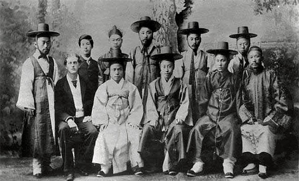 보빙사 일행. 미국으로 출발하기 직전 일본에서 찍은 사진으로 추정된다. 앞줄 앉은 이 왼쪽부터 퍼시벌 로웰, 홍영식, 민영익, 서광범, 우리탕, 뒷줄 선 이는 왼쪽부터 현흥택, 미야오카(일본인 통역), 유길준, 최경석, 고영철, 변수. 조선의 보빙사는 당시 미국 정계에는 한갓 흥미로운 에피소드를 남겼을 뿐이지만, 미국 개신교계에는 조선 선교 붐을 일으키는 기폭제가 되었다. 전우용 제공