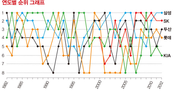 ‘주성분회귀분석을 이용한 한국 프로야구 순위’(2012, 배재영·이진목·이제영)는 투수 부문 17개, 타자 부문 20개 변수를 이용했다. 연구에 참여한 이제영 영남대 교수(통계학)는 “장기 데이터를 모아야 통계적으로 예측의 정확성을 높일 수 있는데 외국인 투수, 팀 이적, 신인 선수 등의 변수가 많다. 특히 외국인 투수들이 승패에 상당한 영향을 미친다. 생각보다 예측이 잘 맞지 않는 부분이 있다”고 했다. 사심을 담아, 이대로 쭉 2013년 프로야구가 3월30일 오후 2시에 개막한다. NC 다이노스가 창단되면서 9개 구단 체제로 경기가 돌아간다. 팀당 128경기, 모두 576경기를 치른다. 남정연 한국야구위원회(KBO) 홍보팀 과장은 “9구단 체제로 바뀌면서 팀당 경기 수는 조금 줄었지만 전체 경기 수가 늘면서 정규시즌 기간도 늘어나게 됐다. 무조건 한 팀은 휴식을 해야 하는 변수도 생겼다. 선발투수 운용에도 영향을 미친다. 이같은 변화가 전력에 도움이 될지 안 될지 지금으로서는 예측하기 어렵다”고 했다. 기존 8개 팀 시절의 자료를 가지고 이뤄졌던 예언들은 사실상 모두 도루묵이 됐다는 얘기다. 3월22일 현재 프로야구 시범경기 순위는 KIA가 1위, 두산이 2위다. 사심을 담아, 이대로 쭉 가면 좋겠다. 김남일 기자 namfic@hani.co.kr