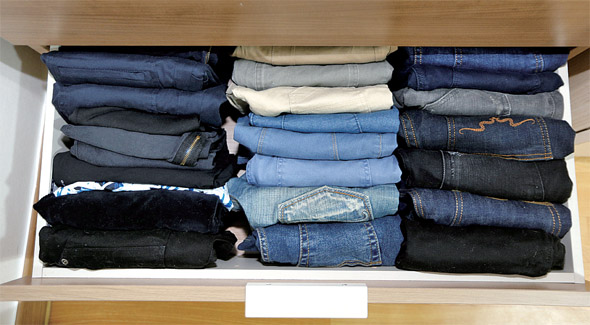 옷장 여기저기 흩어져 있던 바지를 모아 서랍 한 칸에 정리했다. 이현주 정리 컨설턴트는 “제대로 분류를 마치면 정리 뒤 물건을 찾는 데 소비하는 시간이 줄어든다”고 말했다.