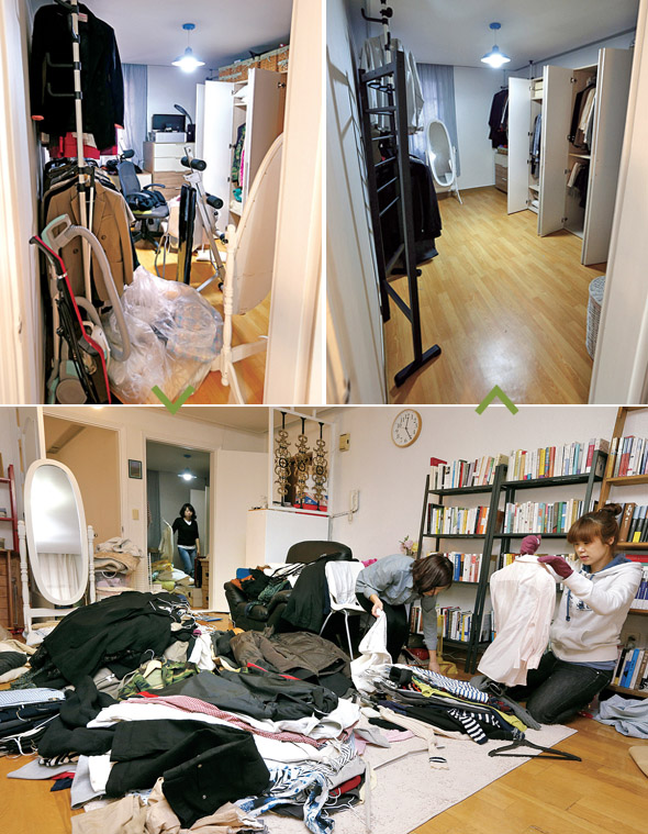 정리를 하기 전에 물건들이 뒤죽박죽 섞여 있었던 옷방. 컨설턴트의 조언을 들으며 정리를 마치니 숨어 있던 공간이 드러났다.