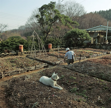 하루 종일 시간 내어 뒷산에 가서 나무를 베어 엮어 올림밭을 만들었다. 말뚝을 박아놓고 나무줄기를 엮었다. 들이가 한가로이 구경을 하고 있다. 강명구 제공