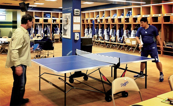지난 3월 말 LA 다저스의 전지훈련장인 미국 애리조나주 글렌데일의 캐멀백랜치 로커룸에서 류현진이 돈 매팅리 감독과 탁구를 즐기고 있다. 류현진 트위터