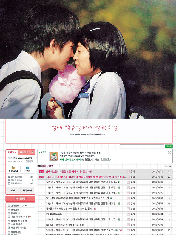 기자는 “충격적”이라고 하지 못해 “새롭다”고 에둘러 말했고, 그들은 “새롭게 보일 수는 있지만, 새로운 이야기는 아니다”라고 답했다. 그들의 일상이란 것이다. 십대섹슈얼리티인권모임(대리인)은 지난 4월부터 ‘나는 처녀가 아니다- 청소년의 섹슈얼리티에 대한 발칙한 페이스 선언’ 운동을 벌였다. 5월8일까지 27개 선언이 카페(cafe.naver.com/youthsexualright)에 올라왔다. 대리인은 ‘부끄러울 것도, 죄지은 것도 없는 청소년들의 당당한 페이스 선언’이라고 부제를 붙였다. 여기엔 성폭행 같았던 첫 경험, 연애 못하는 자신을 루저로 느끼는 순간, 성소수자 청소년의 고군분투, 심지어 사도마조히즘(SM) 취향까지 다양한 이야기가 있다. 대리인 활동가 쥬리는 “관심은 있지만, 활동에 나서지 못하는 이들에게 말할 기회를 주고 싶었다”며 “모르는 이들이 보내온 선언을 보면서 슬프기도 하고, 화가 나기도 했다”고 말했다. 충격적 고백은 자주 간절한 목소리에 실린다.