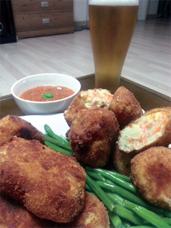 으깬 감자에 당근과 옥수수, 파슬리를 넣어 속을 만들었다. 달걀물을 풀고, 접시에 밀가루를 넉넉히 담아 튀길 준비를 하는데…, 아뿔싸! 빵가루가 없다. 아쉬운 김에 냉동실에 보관하던 식빵 몇 장을 살짝 구운 뒤 갈아서 빵가루를 만들었다. 밀가루, 달걀물, 빵가루 순으로 튀김옷을 입힌 뒤 카놀라유에 살짝만 튀겨냈다. 토마토 소스는 끼얹지 않고 따로 준비해뒀다. 시원한 맥주잔을 옆에 두고, 잘 튀겨진 크로켓을 호호 불어가며 먹었다. 그냥 먹어도, 소스에 찍어 먹어도 맛은 괜찮았다. 그런데 뭐지, 이 허전한 느낌은?