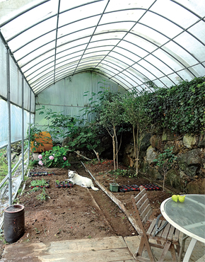 그 밖에 경험상 권하고픈 사안을 소소하게 적으면 다음과 같다. 온실 천장은 높아야 답답하지 않다. 나의 경우 450cm는 족히 된다. 그 대신 천장은 반투명 단열재로 보온에 신경 썼다. 온실 뼈대인 파이프는 많은 눈에 대비해 촘촘히 배치했고, 오래가는 장수비닐을 두 겹으로 치고 3~4년에 한 번씩 갈아주었다. 온실의 3분의 1 정도는 벽돌을 깔거나 나무 데크로 치장해 편안한 휴식 공간이 되도록 했고, 주변에 선반을 마련해 연장도 가지런히 정리했다. 그리고 겨울 동안 물 줄 것에 대비해 남쪽 구석에 커다란 플라스틱 저수조를 마련했다.
