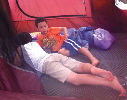 마감 끝낸 좀비로 집에 갔더니 거실 한복판에 선풍기를 틀어놓은 채 아들 녀석과 대자로 뻗어서 자고 있는 와잎. 참 열심히 산다 살아~. 바람을 강풍으로 해서 와잎에게 집중시킨 뒤 나도 잠을 청했다. 아침녘에 일어나니 다행히 비는 오지 않았다. 거실로 나가보니 아들 녀석은 혼자 놀고 있고 소파에는 웬 선풍기 아줌마가 이불을 덮고 누워 있었다. 얼굴 빵빵한 선풍기 아줌마는 콜록콜록 감기에 걸린 것 같다며 안방으로 사라졌다. 아들 녀석에게 아침을 먹이고 거실을 대충 치우고 캠핑장비를 싸는 동안에도 선풍기 아줌마는 인기척이 없었다. 많이 아픈가? 우선 장을 보고 있을 테니 연락하라며 재촉하는 아들 녀석과 집을 나섰다. 같이 가기로 한 (보수정치에 종을 치겠다는) 진보정치인 K와 그의 중학생 아들을 만나서 장을 본 뒤 와잎에게 다시 전활 했다. 선풍기 아줌마는 죽을 거 같다고 했다. 감기가 아니라 숙취 때문 아니니?