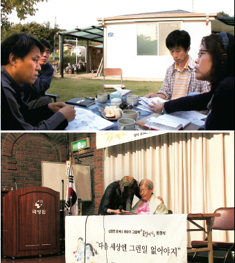 욱일승천기 문제를 놓고 한국 출판사 관계자, 작가와 논쟁을 벌이는 권윤덕씨(위 맨 오른쪽). 그가 그림책 헌정식에서 심달현 할머니께 책을 드리고 있다.시네마달 제공