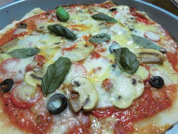 도를 완성할 차례였다. 도마와 밀대에 밀가루를 펴 바르고, 반죽을 올렸다. 처음엔 손으로 눌러 모양을 잡은 뒤 밀대를 사용했다. 최대한 얇게 만들고 싶었다. 계속 밀었다. 역시 밀가루를 살짝 발라둔 둥근 오븐팬에 도를 올린 뒤 주변의 남은 부분을 칼로 정리했다. 너무 얇았나. 살짝 찢어진 부분을 남은 반죽으로 봉합했다. 도를 균일하게 익히기 위해 포크로 여기저기 구멍을 뚫었다. 준비해둔 토마토 소스를 펴 바르고, 각종 토핑과 치즈를 올린 뒤 280℃로 예열한 오븐에 15분 동안 구웠다. 얇은 도는 금세 노릇하게 익어갔다. 치즈가 지글거리는 소리를 내며 녹아들었다.