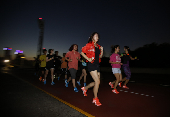 8월19일 서울 잠실종합운동장 인라인스케이트장에서 열린 ‘푸마 나이트 트레이닝 데이’에 참가한 사람들이 달리기 연습을 하고 있다. 가을밤에도 초보 러너들을 위한 ‘러닝페스티벌’은 계속 이어질 전망이다.정용일