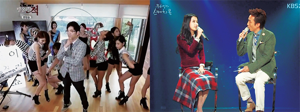 ‘이적쇼’에는 음악적 영감을 주는 뮤즈와 이적걸스가 등장해 깨알 같은 웃음을 주었다. 이들을 통해 뮤지션 이적의 이면이 드러난다는 것이 의 설정이었다.(왼쪽) 여성아이돌이 나올 때마다 유난히 매서워지는 유희열의눈은 ‘매의 눈’으로 불린다.에 아이유가 출연해 유희열과 이야기를 나누고 있다.(오른쪽) KBS 제공