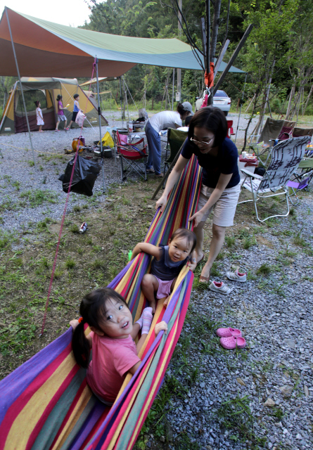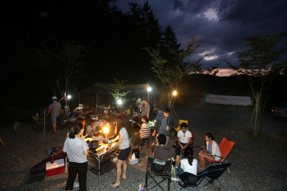 새벽부터 설쳐대는 아들 윤재 때문에 서둘러 짐을 부린 뒤 석대인 부자와 출발했다. 중간에 승주네 식구를 태우고 점심까지 때운 뒤 꿈의마을 캠핑장에 도착하니 오후 2시가 넘었다. 캠핑장은 오픈한 지 얼마 안 돼 깨끗하고 호젓했다. 화장실과 샤워실도 쾌적했다. 와잎과 승주 엄마는 애들을 데리고 근처 냇가로 물놀이를 가고 승주 아빠와 둘이서 베이스캠프를 설치했다. 한낮의 뙤약볕에 1시간30분 동안 야무지게 타프와 텐트를 쳤다(‘뼛속까지 캠퍼’는 나밖에 없었으므로 ‘가오’를 위해 완전 빳빳하게 쳤는데 나중에 아무도 몰라보더라는). 곧바로 서군인 기자와 지인이 사무실에 놓여 있던 술과 짐을 싣고 도착했다. 서군인은 텐트를 쳐본 적이 없다고 했다. 군인 맞니? 옆에서 거들고 있는데 기세영 기자 가족, 이미녀 팀장 가족이 속속 당도했다. 아이들과 물놀이 갔던 와잎과 승주 엄마도 돌아왔다. 이리 가서 줄 잡으랴, 저리 가서 못 박으랴, 여기 와서 소개하랴 정신이 없었다.