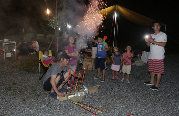 해가 지고 있었다. 자리를 잡고서 제대로 인사를 나누고 있는데 일 보고 돌아온 석대인이 텐트를 치자고 부른다. 석의 소라개껍데기 같은 텐트를 치고 돌아오니 애들이 불꽃놀이를 하게 해달라고 조른다. 종이박스로 발사대를 만들어 불을 붙여줬다. 좋아라 하는 아이들 뒤로 보니 이제는 승주 아빠가 고길 굽고 있었다. 아 놔~, 그 많은 기자들은 어디로 갔을까? 35명의 떼꾼들은 몇 군데로 무리지어 고기를 굽고 술을 마셨다.
