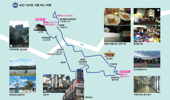 한 때 새로웠지만 이젠 낡고 뒤떨어진 한참을 걸어 다시 신사역 버스정류장에 당도했다. 강남역·양재·도곡을 지났다. 경쟁하듯 하늘을 향하는 아파트촌을 지나 대치동 미도아파트 정류장에 닿으면 오래된 아파트촌이 나온다. 은마와 미성 아파트 단지가 마주 서 있다. 먼 미래의 역사서에는 이 지역을 두고 ‘논밭이 금밭 될 뻔했던 현장’이라고 기록할지 모른다. 다큐멘터리영화 <모래>(2011)의 강유가람 감독은 이곳을 두고 모래성처럼 부스러져 없어질 수도 있는 재개발 환상을 이야기하기도 했지만, 어쨌거나 사람이 모여 있는 곳이므로 사람 냄새가 난다. 눈에 띄고 싶어 안달하는 간판들이 조밀하게 붙은 은마 상가 지하로 들면 재래시장을 방불케 하는 풍경이 펼쳐진다. 떡집, 생선가게, 털실가게, 쌀가게, 옷수선집, 반지 세공 가게, 소파 천갈이하는 곳까지, 몇 시간 전 지나온 남대문시장을 압축해놓은 듯하다. 국을 포장해 파는 가게에서는 커다란 솥에 육개장이 푹푹 끓는다. 칼국숫집과 분식집에 사람이 넘친다. 끈적한 기름때가 낀 메뉴판을 보니 2천원짜리부터 시작해 4천원을 잘 넘지 않는다. 버스는 다시 달린다. 대치동과 개포동을 지나는 길에 펼쳐진 아파트촌과 낡은 상가들, 키 작은 주공아파트 단지는 1980~90년대 도시가 팽창하던 때를 목격한 이들에게 익숙한 풍경이다. 한때는 새로웠던 그 공간이 이제는 낡고 뒤떨어져감을 차창 밖으로 목도한다. 종점을 몇 정거장 앞두고 가든파이브 공구상가 정류장에 내렸다. 상가는 듣던 대로 텅 비어 있었다. 베어링 판매상 오아무개씨는 청계천에서 15년간 장사하다 3년 전에 이곳으로 옮겨왔다고 했다. 오씨는 “잘될 거라는 비전을 보고 왔는데 이렇게 상가에 활기가 돌지 않으니 불안하다. 앞으로 행여 용도 변경이라도 해버리면 어디로 가야 할지 잠이 오지 않는다”고 말했다. 스산한 상가를 뒤로하고 나오니 어느덧 날이 서늘해졌다. 장지공영차고지 정류장에서 나는 마지막 승객이었다. 해가 저물어 주변이 빠른 속도로 어두워진다. 여행자는 발걸음을 재촉한다. 하지만 늘 계획보다 한 템포씩 늦는 게 여행이라 생각하며 다음 버스를 기다린다. 돌아가는 길은 혜화동으로 향하는 301번을 탔다. 잠실을 지나 탄천을 건너 동호대교를 타고 한강을 넘는다. 검은 강이 흐르는 밤의 서울은 아름답다. 모든 게 어둠 속에 녹아들고 반짝이는 것들만 남았다. 장충동 동국대입구 정류장과 광희동 정류장 사이에는 오래된 족발집이 촘촘하다. 어디가 맛집이라더라? 가물거리는 기억을 헤매는 사이 버스는 다음 정류장에 당도했다. 광희동에 내려 김수근이 설계한 경동교회를 한 바퀴 돌고 올까 하다가 마음을 접었다. 동대문역사문화공원 정류장에 내리니 불야성의 동대문시장이 펼쳐진다. 남대문이 낮의 시장이라면 동대문은 밤의 시장이다. 쿵쿵, 거리에 음악 소리가 높다. 옛 동대문운동장 뒤편 도매시장 도로가에 커다란 옷가방들이 충북 청주, 부산, 전북 전주… 행선지에 따라 줄지어 서 있다. 집 앞 버스정류장의 아무 버스나 타고 밤 9시, 마지막으로 당도한 곳은 301번의 회차 정류장인 혜화동로터리. 정류장 근처에 ‘15개에 5천원’이라는 종이를 써붙인 사과 노점이 있다. 노점상이 사과 하나를 깎아 저녁 식사를 대신한다. 번잡한 대학로를 등지고 성북동 방향으로 걷는다. 슈퍼마켓 2층, 옷가게 사이에 소극장들이 조용히 내려앉았다. 10층 정도로 보이는 낮은 아파트 입구에 ‘명륜동 주상복합 아파트’라고 쓰여 있다. 과연 아래층에 몇몇 상가가 불을 밝히고 있다. 잠실에서 미끈하게 빠진 주상복합 아파트들만 올려보다가 소박한 아파트를 만나니 반갑다. 더 걸으면 1930년대 지어졌다는 장면 전 총리 가옥이 나온다. 다시 대학로로 발을 돌려 50년을 훌쩍 넘긴 오래된 카페 학림다방에서 마지막 여정을 썼다. 다방에서 직접 만들었다는 크림치즈케이크를 시켰다. 토끼 문양이 새겨진 케이크는 푸딩 같기도 양갱 같기도 하다. 오렌지잼을 발라 맥주와 함께 푹푹 퍼먹었다. 다시 혜화역 마로니에공원 정류장에 서서 미아리고개를 넘어 무량사 입구에 당도하는 104번, 정릉을 향하는 143번 따위를 타고 북진을 궁리하다 밤이 깊어 멈추었다. 시내버스 여행은 게으른 여행자에게 맞춤이다. 집 앞 버스정류장의 아무 버스나 타고 출발할 수 있다. 촘촘히 계획을 짜지 않아도 좋다. 버스 노선이 이미 촘촘하므로 길 잃을 염려가 없다. 목적지를 향하다가 마음이 바뀌어서 혹은 흔들흔들 유람하는 버스에 앉아 깜박 잠이 들어 내리지 않아도 그만이다. 예정에 없던 길을 달리면서 우리는 여행객의 시선으로 창밖을 바라본다. 평소 스마트폰에 고개를 박고 있느라 놓쳤던 조각들이다. 오래됐거나 바뀌었거나 혹은 느리거나 빠르거나, 같고도 다른 여러 결의 도시를 만나게 되리라. 신소윤 기자 yoon@hani.co.kr