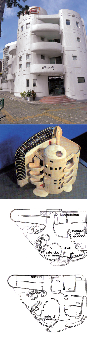 이런 양성적 이미지는 그의 작품 도록에 남아 있는 평면도에서 여실히 드러난다. 도면에서 두드러지는 것은 강렬한 성적 메타포다. 건물 서북쪽에 곡면으로 돌출시킨 램프(경사로)실 때문인데, 영락없이 굳게 발기한 남근의 생김새다. 그뿐인가. 램프실 아래 매달리듯 배치한 타원의 격벽은 아무리 봐도 잘 여문 고환의 형상을 염두에 두었음이 분명하다(얄궂게도 이 방은 간호원실로 계획됐다). 그러나 이 공간을 램프실과 떼어놓고 바라보면 또 하나의 상이 겹쳐진다. 이제 막 태동을 시작했음직한, 웅크린 태아의 모습이다. 이 방 맞은편에 위치한 의사 집무실은 격벽이 음표 꼬리처럼 휘어지며 두 공간 사이에 만들어진 보행동선에 리듬감을 배가한다.