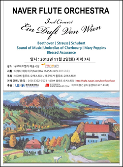 오롯이 플루트만으로 구성된 연주회가 열린다. 나의 사랑 플루트 카페의 네이버 플루트 오케스트라가 일본 후쿠오카 플루트 오케스트라와 함께 ‘빈의 향기’ 연주회를 11월2일 저녁 7시 서울 구로 아트밸리 예술극장에서 연다. 피콜로, 알토·베이스 플루트 등 다양한 음역대의 플루트 연주가 곡 해설과 함께 펼쳐져 관객의 이해를 돕는다. 플루트의 매력을 알려줄 연주회의 1부에서는 오스트리아 빈에서 활동한 베토벤과 슈베르트의 음악이, 2부에서는 빈을 배경으로 한 <사운드 오브 뮤직>의 영화음악이 연주된다. 문의 010 2392-7571.