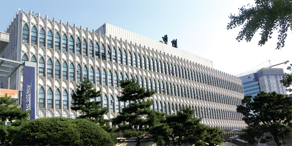 연세대 학생회관 전경. 초대 학생회관장 반피득은 하늘로 치솟은 고딕식 아치창이 신과 인간의 관계를, 횡으로 결속된 창들의 연쇄는 인간과 인간의 관계를 표상한다고 했다. 이 건물은 건축의 어휘로 번안된 종교적 상징, 십자가였다.이세영
