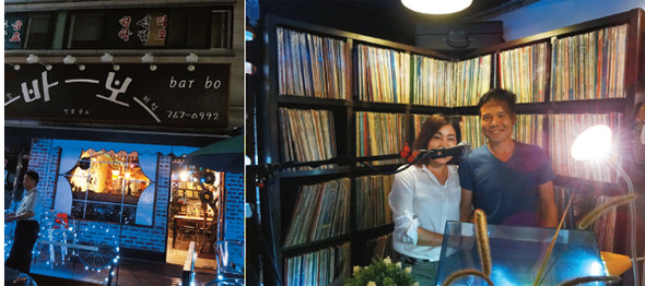 바보 카페의 실외 풍경(왼쪽)과 레코드판 앞에 선 윤현 사장 부부. ‘바보’는 간판이 나타내듯 김도향의 노래 에서 따온 것이다. ‘bar bo’로 표시한 영어 표기가 귀여우면서도 그의 영어 실력의 한 자락을 드러낸다.강명구 제공