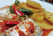 ‘프라이드 반·양념 반’의 원칙에 입각해 한 마리로는 간간한 조림을 만들고, 나머지 한 마리는 팬에 굽기로 했다. 다시마와 멸치로 육수를 뽑는 동안 무와 감자 양파를 썰어두고 간장과 다진 마늘, 고춧가루로 양념장을 만들었다. 냄비 바닥에 무와 감자를 깔고 손질된 갈치를 올렸다. 단맛이 너무 강해지지 않도록 양파는 조금만 넣었다. 양념장을 적당히 덜어 육수를 붓고 자박하게 조리면 끝이다. 청·홍 고추를 마지막에 더한 뒤 조금만 더 끓여냈다.