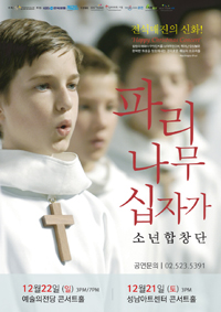 겨울이 되면 나타나는 소년들이 있다. 소년 아카펠라 합창단 파리나무십자가 소년합창단이 크리스마스 시즌을 맞아 한국을 찾는다. 12월10일 안양아트센터를 시작으로 수원·전주·부산·대구 등을 거쳐 12월22일 서울까지 총 10개 도시에서 공연을 펼친다. 보이 소프라노의 진수를 보여주는 모차르트의 <자장가>와 슈베르트의 <붉은 장미>, 샤를 구노의 <아베마리아>, 캐럴 <고요한 밤 거룩한 밤> <징글벨>을 비롯해 아이티 아이들을 위로하는 <아이티 셰리>, 알제리 독립전쟁을 배경으로 한 뮤지컬 영화 <쉘부르의 우산> 삽입곡인 <목소리를 위한 협주곡> 등 대중에게 익숙한 곡과 의미 있는 곡들을 조합한 프로그램을 마련했다. 문의 02-523-5391.