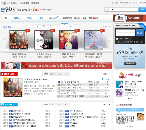 예스24의 e연재(사진), 네이버 웹소설 서비스 등에서 제공하는 장르물은 한 회를 읽는 데 5~10분 정도가 소요된다. 이동 중이나 자투리 시간에 접속하는 사용자가 많다.예스24 제공