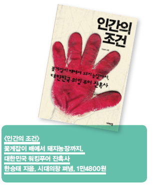 이 책은 꽃게잡이 어선, 편의점과 주유소, 돼지농장, 비닐하우스, 자동차 부품 공장 노동자들의 삶을 기록한 글이다. 어떤 의미에서 보면 앞서 말한 비유적인 면식범에 쫓겨 각자의 쓸쓸한 최후를 향해 달려가는 사람들의 이야기라고도 할 수 있을 듯하다. 물론 기업이 개인의 삶을 목 조르는 모습이 품속에 칼을 숨긴 채 부모의 침실로 숨어드는 아들만큼 극적이진 않다. 오히려 그것은 치사하고 때로는 좀스럽다고 부를 만한 방식으로 나타난다. 몇 년 전 내가 일했던 돼지농장에서는 마스크를 한 달에 3개씩 지급해줬다. 그것은 농담이나 다름없는 양이었다. 20∼30분만 우리 안에서 작업해도 돼지 똥을 온몸에 뒤집어쓰기 때문이다. 그렇다고 우리 회사(그곳은 식품 기업의 계열사에서 운영하는 농장이었다) 관리자들이 이기적인 구두쇠였다는 건 아니다. 모두 점잖고 예의 바른 사람들이었다. 문제는 소모품 비용이 한 달 150만원으로 정해져 있었고 그 안에서 구매할 수 있는 마스크의 최대 양이 3개였던 것이다.