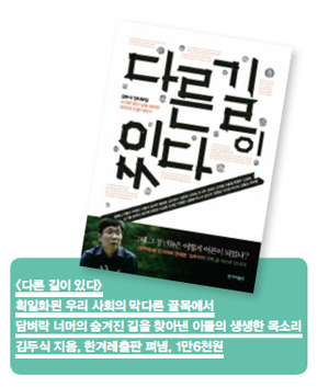 지금 이 순간 안녕치 못한 친구들, 저와 똑같은 공포를 느끼는 소심한 분들과 함께 읽고픈 책이 <다른 길이 있다>입니다. 이 책에는 정혜신, 이명수, 박경신, 고종석, 유시민, 윤태호, 김조광수, 김연희, 고미숙, 유시주, 김대진, 신대철, 이충걸, 변영주, 김성희, 강기훈, 문부식, 공지영, 하종강, 이상호, 인재근, 천명관, 김종배, 박노자, 송인수, 김창남, 이진순, 박선숙, 김홍신, 유숙렬 등 서른 명의 인생 이야기가 담겨 있습니다. 획일화된 우리 사회의 막다른 골목에서 담벼락 너머의 숨겨진 길을 찾아낸 이들의 생생한 목소리입니다. 절망하는 친구들과 ‘다른 길이 있다’ 서로 격려하며 답답한 시대를 헤쳐가고 싶습니다. 이 책의 투박한 표지는 크기·색깔·제목 모두 시위용으로도 안성맞춤이라 남은 4년 내내 읽고 깔고 들기에 유용할 겁니다.