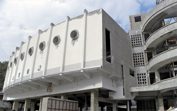 리모델링 공사가 한창인 광주시민회관. 2011년 철거 위기에 몰렸다가 문화계 인사들의 발의로 살아남았다. 완만한 호(弧)를 이뤄 돌출시킨 파사드(전면부)에 수직 루버와 원형 채광창이 더해져 가야금 같은 전통 현악기를 연상시킨다.이세영