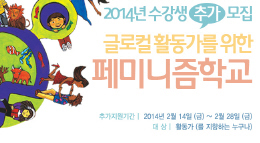 지구지역행동네트워크가 운영하는 페미니즘 학교가 3월부터 열린다. 지구화와 지역화를 합성한 단어인 ‘글로컬’을 지향하는 지구지역행동네트워크가 다섯 번째로 진행하는 프로그램이다. 활동가들이 자율적 학습과 실천을 통해 자신을 재충전하는 기회인 페미니즘 학교는 ‘액티비즘 프로그램’과 ‘액티비즘 언어 프로그램’ 등으로 구성된다. 고정갑희·공유정옥 등은 물론 지구지역행동과 연대하는 해외 단체 활동가도 강사로 나선다. 생태주의와 페미니즘과 마르크스주의, ‘적녹보라’ 패러다임이 프로그램에 녹아 있다. 지원 기간 2월14~28일, 지원서 작성 뒤