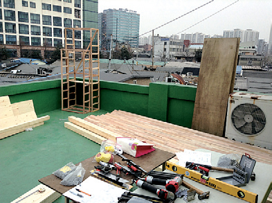 그리하여 그럴듯한 공간까지는 안 되어도 베이스캠프 정도 만들어보기로 했다. 서울 문래동. 도시의 멸종되어가는 오랜 이 준공업 동네는 또한 몇 년간의 꾸준한 문화적 밑천의 획득으로 6년 전에 비한다면 2배 이상 오른 임대료를 내야 한다(이제 아이러니도 아닌 뻔한 이야기). 그래도 뿌리 없는 이 도시에서 꽤나 오랜 시간 정붙여온 동네라 이곳에 자리를 펴기로 결정한다. 강점기에 지어진 집합 숙소였다는 영단주택의 남루한 지붕이 발 아래로 펼쳐지는 3층에는 재밌게도 옥상이 2개나 있고 2층에는 옥상이랄지 마당이랄지 모를 묘한 공간이 또 펼쳐져 있다.