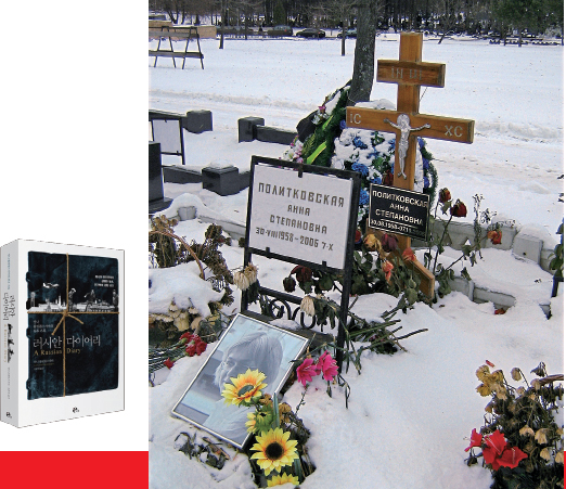 안나 폴릿콥스카야가 의문의 피살을 당한 지 8년이 지났지만 아직도 죽음을 둘러싼 의혹은 밝혀지지 않았다. 그의 묘지에 추모의 꽃다발이 놓여 있다.위키미디어 커먼즈