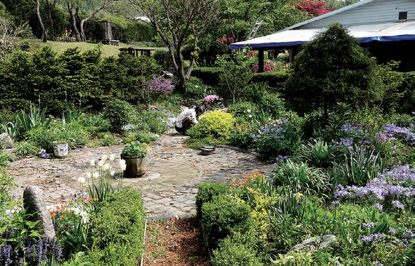 주목으로 담을 둘러친 30평 정도 되는 아내의 공간. 화창한 날, 꽃밭에서 ‘꿈을 꾸는’ 아내. 강명구 제공
