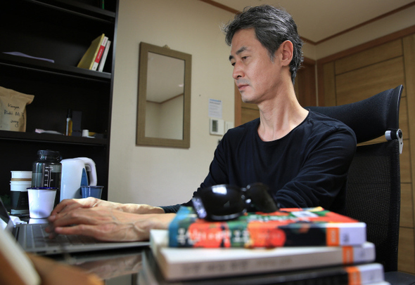 연희문학창작촌의 집 필실에서 정영문 작가 가 작업을 하고 있다 . 탁기형 선임기자 khtak@hani.co.kr