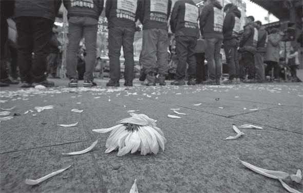 <그의 슬픔과 기쁨>이 쌍용차 해고노동자의 목소리를, 위에서도 아래에서도 아닌 그들의 시선 그대로 전달했다면 <아무도 잊혀지지 마라>는 이들의 투쟁 현장 속에 녹아 들어간 자의 시선으로 담아냈다. 저자 점좀빼는 쌍용차지부 대외협력실장 고동민씨에게 언젠가 “같이 싸워야 하는데 그러지 못해 미안하다”고 했다지만 그는 늘 함께 싸운 자였다. 고동민씨는 “단순한 기록자가 아닌 싸움의 한복판에서 끝까지 기억하는 자가 되겠다는 그의 다짐과 마음”이 와닿았다고 말한다. 그래서 그가 기록한 사진들은 시위와 투쟁의 가장 가운데에 있다. 그것은 가장 치열한 장면들이기도 하지만 동시에 가장 쓸쓸하기도 하다. 바깥에서는 늘 결기에 차 보이지만 사실은 지친 해고노동자들의 뒷모습이나 피곤한 듯 얼굴을 감싸쥔 모습 같은 것, 점좀빼는 뭐라 말을 건네는 대신 카메라에 그 순간들을 담았다. 혹은 서울 대한문 분향소 앞에 놓였던 작은 화단, 한때 해고노동자가 공장에서 신었을 워커에 담긴 화사한 꽃의 대비가 애잔하다. 불안하고 고독한 그곳에도 사람이 있으니 꽃망울 터지는 순간 같은 기쁨이 있었으리라, 우리는 짐작하고 덕분에 조금 안도한다.