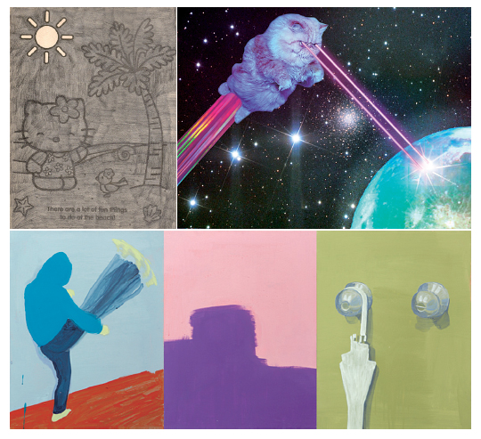 등신미를 상징하는 작품들. 박미나의 〈At the best beach!_PAPERMATE B〉, 힙스터의 ‘등신미’를 상징하는 표상으로 자리잡은 〈Space_cat〉, 이우성의 〈자폭〉(왼쪽부터 시계방향).