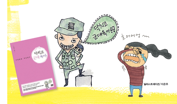 ‘아프니까 청춘’인 20대가 사회 부조리를 그저 참게 유도한다는 비판을 받는 것처럼 ‘군대육아’ 역시 여러 지점에서 논란을 낳는다. 책육아 방식이 그렇다. 책육아를 거칠게 말하면 ‘닥치고 책만 읽히라’는 것이다. 텔레비전 치우고 한 달에 한 질씩 전집을 사서 다양한 책을 쉽게 접할 수 있는 환경을 만들어준다. 아이가 실컷 놀다가 책에 관심을 갖거나 책을 가져오면 재미있게 읽어준다. 영어책·한글책 구분 말고 열심히 읽어줬더니 저자의 딸은 41개월에 혼자서 원하는 책을 읽는 ‘읽기독립’이 이뤄졌고 영어원서도 읽게 됐다.