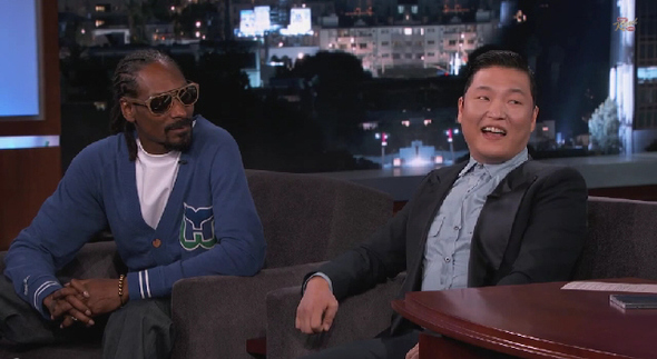 〈행오버〉를 발표한 싸이는 스눕독과 함께 미국 토크쇼 〈지미 키멜 라이브〉에 출연했다(위쪽). 그의 전작인 〈젠틀맨〉이 〈강남스타일〉의 연장선에 있다면 〈행오버〉에서는 음악적 방향 전환을 시도했다. 유튜브 갈무리, YG엔터테인먼트 제공