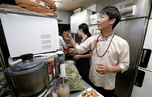티베트 전통 상의를 입은 민수(오른쪽)씨와 이근혜씨가 티베트 음식점 ‘포탈라’ 주방에서 점심 손님을 맞기 위해 음식을 만들고 있다. 김명진