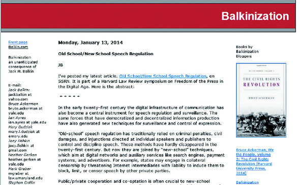 인터넷이라는 기술 진보는 인류에게 표현의 자유를 선사하고 있는가? 이 질문에 미국 헌법학자 잭 볼킨은 쉽게 긍정하지 않는다. 2003년부터 개인 블로그를 운영하고 있는 예일대 법대 교수 볼킨은 표현의 자유를 연구한다. 볼킨은 2014년 1월 ‘표현의 자유를 규제하는 낡은 방법과 새로운 방법’이라는 글에서, 개인의 표현의 자유를 직접 억압하는 방식을 구식으로 정의한다. 고발과 체포 등 개인의 입에 재갈을 물리고, 신문을 폐간하고, 방송을 통제하는 방법이다. 표현의 자유를 제약하는 새로운 방식은 개인을 겨냥하지 않는다. 통신망, 포털, 소셜네트워크서비스(SNS)를 운영하며 막대한 수익을 거두고 있는 기업들이 정부 당국의 직접 규제 대상이다. 볼킨에 따르면, 이 기업들은 특정 이용자의 목소리를 다른 사람이 들을 수 없게 만들 수 있는 기반시설을 운영하고 있다. 시민이 표현하려는 바를 떠들어도 이를 듣는 사람이 없게 만드는 것, 이것이 새로운 표현의 자유 통제 방법이다. 감시사회에서 표현의 자유를 연구하는 볼킨 교수는, 잔인한 구식 통제 방법보다 통신사, 포털 및 검색 서비스 사업자 등을 통제해 표현 그 자체보다는 표현의 전달 및 확산을 제한하는 방법이 최근 규제 당국이 선호하는 방식임을 주장한다.
