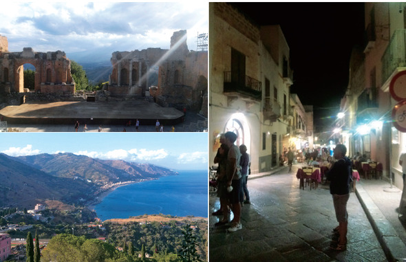 고대 그리스인들은 지중해가 내려다보이는 곳에 도시를 건설하고 극장을 지었다. 파비냐나의 밤은 아늑하고 흥겹다. 여행자 거리에서 월드컵 준결승전을 지켜보는 사람들. 타오르미나 정상에서는 영화 〈그랑블루〉를 찍었던 해변이 내려다보인다(왼쪽부터 시계방향).