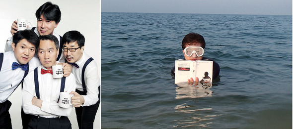 북스피어·피니스 아프리카에 등 소규모 장르문학 출판사가 연합해 지난 7월12일 연 ‘장르문학 부흥회’ 홍보 사진(왼쪽)으로, 사진 앞줄 맨 왼쪽이 북스피어 김홍민 사장이다. 김 대표가 ‘익스트림 리딩 대회’를 기획하며 바다에서 ‘극한 상황’을 연출해 예시사진으로 제공했다. 북스피어 제공