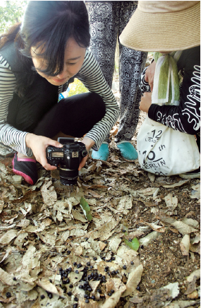 청년기자단이 왕피천 생태탐방로에서 멸종위기동물인 산양의 똥을 발견해 관찰하고 있다.