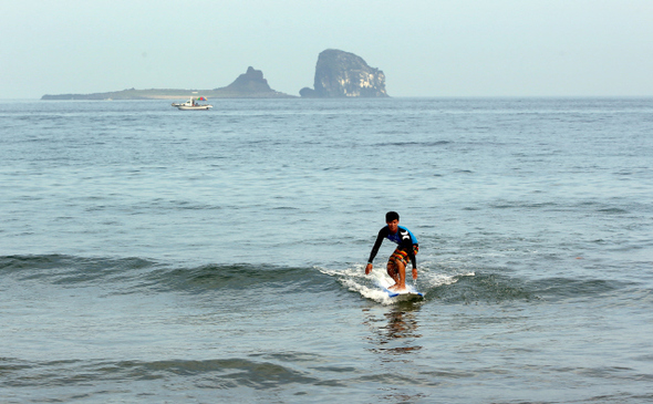 형제섬이 멀리 보이는 사계리 해안에서 서핑 시범을 보이고 있는 성용훈씨. 한겨레21 정용일 기자 yongil@hani.co.kr
