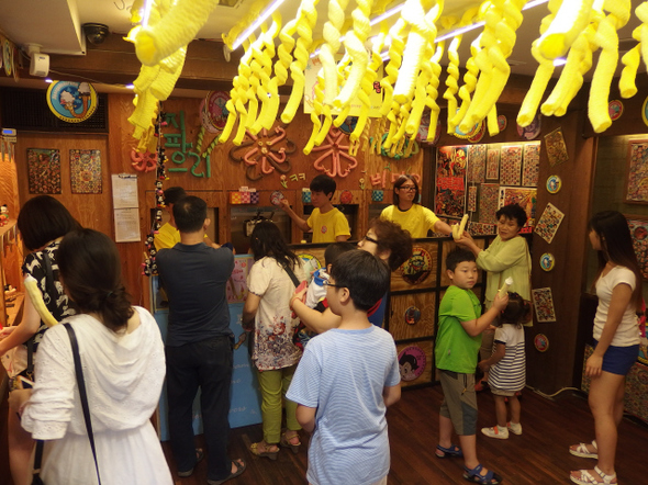 “스페인에서 사 먹은 거보다 더 맛나는데?” 심지어 추로스를 먹고서 춤추는 사람도 있었다. 김재민 부매니저는 전했다. “자주 오는 외국인 손님이 가게 배경음악으로 <엠파이어 스테이트 오브 마인드>(Empire State of Mind)가 나오니까 ‘나 뉴욕에서 왔어!’라고 좋아하면서 춤을 추더라고요. 바로 맞은편에 미군기지가 있잖아요. 점심시간엔 군인도 많이 와요.” 경리단길 주변은 다국적 동네다. 용산구청의 통계 자료에 따르면, 2014년 경리단길이 있는 이태원2동에 사는 등록외국인 수는 984명이다. 이러니 경리단길의 식당을 넘어 거리 음식에까지 세계 음식이 손을 뻗치는 것은 당연하다. 최근 경리단길 거리 음식으로 프랑스 국민 간식인 크레페도 합류했다. 녹사평 대로변에 새로 생긴 ‘롤링크레페’에서 맛볼 수 있다. 1920년대 인사동 거리는 지금의 경리단길과 비슷했다. 이태원 상권이 지나치게 커지면서 조용한 것을 좋아하는 예술가들이 경리단길로 옮겨갔듯, 명동과 충무로에서 이사온 예술가들이 인사동을 만들었다. 서울시립대 도시공학과 김지혜씨의 석사 논문 ‘인사동 내 업종분포 및 이용행태 변화를 통한 장소성 변화에 관한 연구’(2012)에는 “일제강점 이후 1920년대 일본인이 머무르던 명동과 충무로의 상권이 번성하면서 인사동으로 이전하는 세력이 등장”했고, “이들을 중심으로 고미술을 고민하는 계층이 형성”되면서 “인사동은 1970년대 우리나라 고미술 네트워크의 거점 지역으로 성장”했다고 적혀 있다. 이런 전통을 바탕으로 인사동 거리에는 퓨전 간식이 유행이다. 한국의 전통 간식인 꿀타래가 인사동의 어제였다면, 뻥튀기 과자에 아이스크림을 섞은 ‘지팡이아이스크림’이 인사동의 오늘을 대표한다. 지팡이아이스크림은 지팡이 모양 뻥튀기 속에 아이스크림을 넣은 것이다. 이런 퓨전 시도에 경기도 양평의 밀랍떡을 와플기계로 구워 파는 ‘와플떡’도 더해졌다. 종각역에서 들어가는 인사동 초입에 위치한 ‘지팡이아이스크림 가게’는 꼬불꼬불 꼬인 지팡이 과자와 동그란 추억의 딱지 세트로 내부를 장식하고 있다. 지팡이아이스크림을 개발한 조춘호 준팩토리 대표는 “어릴 때 먹었던 개나리콘 맛이 나는 지팡이 과자가 사라지는 것이 아쉬웠는데 여기에 아이스크림을 넣으면 한국적이면서 세계적인 간식이 되겠다 싶었다”고 말했다. 인사동 방문객들이 지팡이아이스크림을 줄지어 사는 데에는 미디어도 한몫했다. 지난해 9월 MBC every1 <손담비의 뷰티풀 데이즈 시즌2>는 인사동 가게에서 촬영했고, 11월에는 MBC <컬투의 베란다쇼>에 나오기도 했다. 네이버 블로그에 ‘인사동 지팡이아이스크림’이라고 치면 4400여 건의 포스팅이 검색되기도 한다. 전북 군산에서 휴가차 놀러온 장지혜(28)씨는 “인사동에 오면 꼭 먹고 가야 하는 음식이라고 봤다”고 말했다. 김지선(24)씨는 이것을 재미로 먹기도 한다. 그는 “뻥튀기 과자와 아이스크림을 한번에 갈비 뜯듯이 먹는 게 재미있다”고 말했다. 지팡이아이스크림이 야시장에 온 듯한 느낌을 준다는 게 지선씨의 생각이다. 지팡이아이스크림은 손잡이를 눕혀 제이(J)자 형태로 잡고 먹는다. 뻥튀기 과자 덕분에 아이스크림이 흐르지 않고, 반으로 갈라 먹기도 쉽다. 안에 들어가는 아이스크림은 바닐라, 바닐라초코, 스트로베리, 블루베리, 다크초코 5가지 맛이 있다. 바닐라가 3천원으로 가장 저렴하다. 남녀 커플은 대개 하나를 나눠 먹는 경향이 있다. 8월5~6일 이틀간 4시간가량 인사동을 지켰지만 한 커플이 아이스크림 2개를 사는 경우는 결코 없었다. 가벼운 주머니 사정 탓이거나 뜨거운 사랑 덕분일 것이다. 단돈 3천원 한 끼의 식사 노량진의 영혼이 깃든 음식은 ‘밥’에서 출발한다. 삼겹살과 제육볶음을 넣으면 ‘컵밥’, 스팸·달걀프라이·김가루가 들어가면 ‘폭탄밥’이다. 일본식 볶음요리 부타모야시덮밥, 베트남식 볶음밥은 최근 들어 주목받고 있는 발명품들이다. 단돈 3천원이면 먹을 수 있다. 노량진의 끼니 음식은 인사동의 아이스크림보다 싸다. 3천원은 경리단길에서 추로스 1개와 초콜릿 소스 1통을 사먹을 돈이다. 4년간 노량진에서 노점을 운영 중인 신정민(37)씨는 “더 비싸게 팔면 학생들이 안 오니까 대체로 3천원을 넘지 않는 선에서 가격을 정한다”고 밝혔다. 이렇게 경리단과 인사동의 길거리 음식이 휴일의 달콤함을 위한 것이라면, 노량진의 길거리 음식은 평일의 생존을 위한 것이다. 지하철 1호선 노량진 역사 앞에 있는 육교에 서서 보면 노량진에는 온통 학원과 노점뿐이다. 재수학원, 경찰학원, 공무원학원, 임용고시학원이 모두 포진해 있다. 집 떠난 입시생과 공시생(공무원 시험 준비생)들이 몰리는 이유다. 닭꼬치를 파는 노점의 박아무개씨는 “수능이 끝나면 손님이 확 줄어. 맛이 없으면 학원에 소문이 싹 도니까 파리만 날리지, 뭐”라고 말했다. 입시생과 공시생이 분초를 다투며 공부하듯, 노량진 노점상들도 맛과 양, 가격 혁신에 골몰해야 하는 것이다. 지난 8월6일 오후 3시, 비가 쏟아지는 와중에도 노점들은 여전히 성업 중이었다. 특히 ‘베트남 현지인이 직접 조리하는’ 베트남 