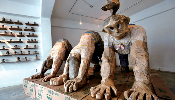 신민 작가의 전시 ‘We’re all made of__’의 대표 작품인 〈견상(犬狀)자세하는 알바생〉이다. 이번 전시는 맥도날드에서 나오는 쓰레기로 만든 작품들로 이루어져 있다. 한겨레21 정용일 기자 yongil@hani.co.kr